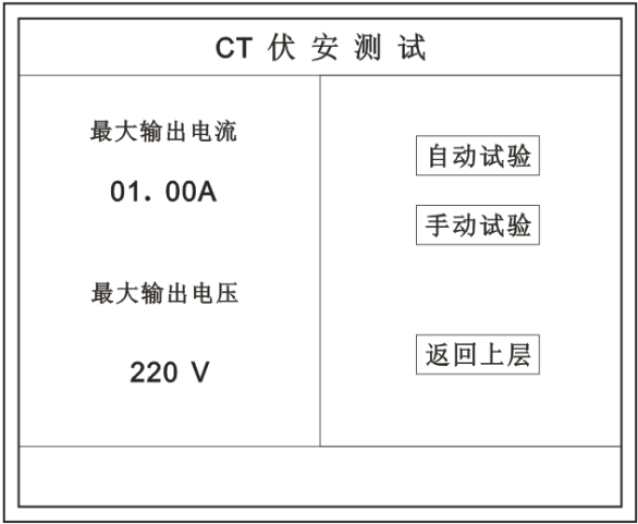在主菜單界面,旋轉(zhuǎn)鼠標(biāo)將光標(biāo)移動到 CT測試 選項(xiàng)上,按下旋轉(zhuǎn)鼠標(biāo)選擇 CT伏安 即可進(jìn)入伏安特性試驗(yàn)設(shè)置界面(如右圖)。光標(biāo)移動至 返回上層 ,按下鼠標(biāo)即可返回主菜單。